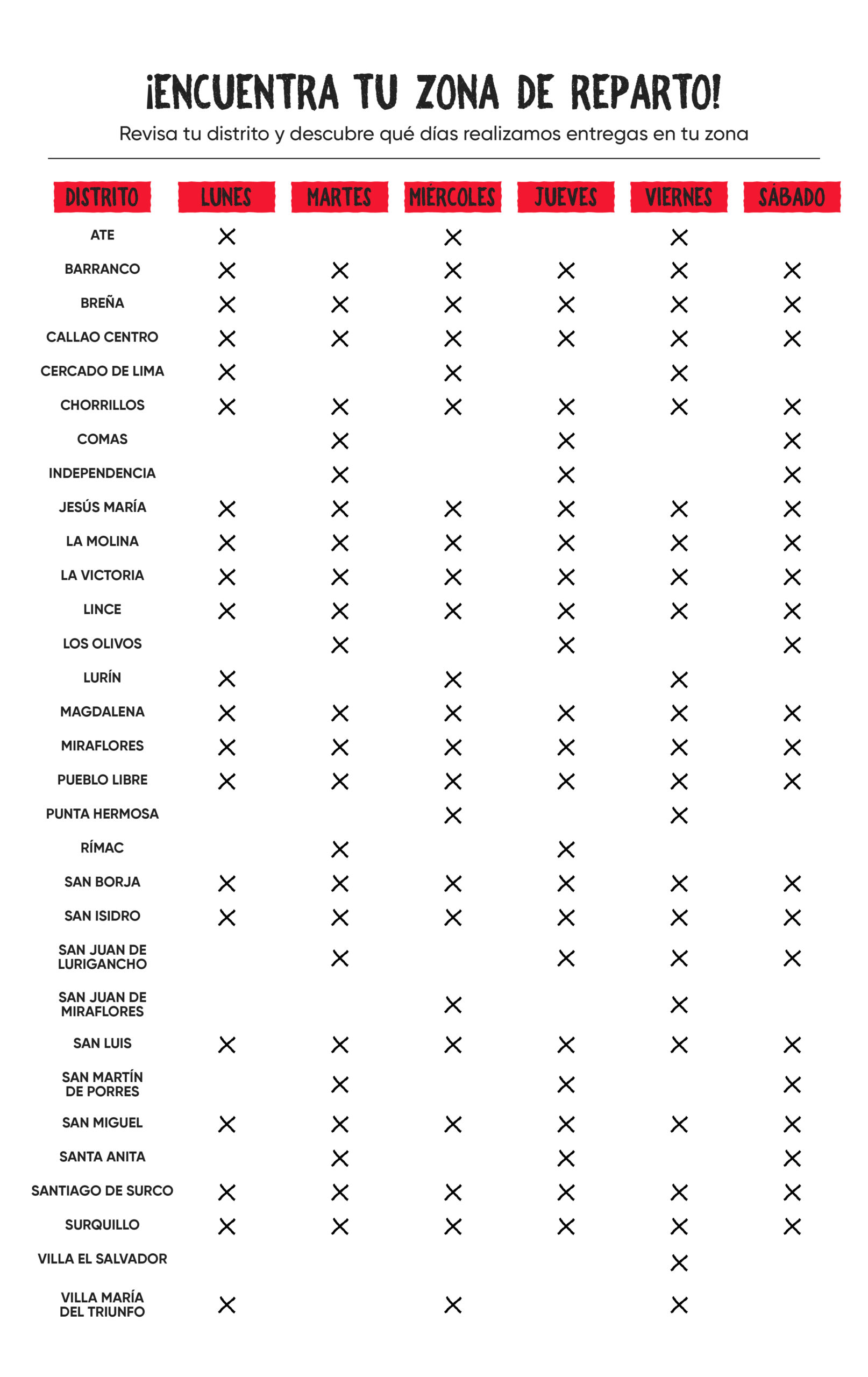 La fecha de envío de los productos está sujeta a una programación según distritos. No se efectúan envíos durante días festivos, ni días no laborables.